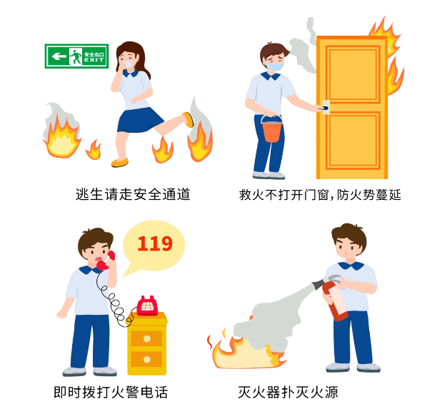牢记火警电话“119”,在发生火灾时迅速拨打报警,并告知详细地址、火源、起火部位、燃烧物质和燃烧情况。