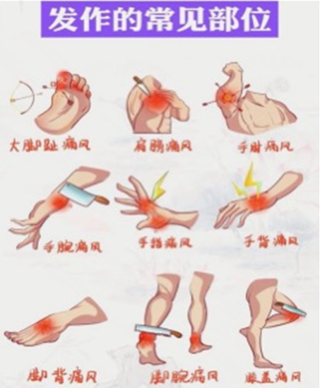 多数患者在深夜或凌晨突然发病,关节剧痛,疼痛在数小时内达到高峰。最常受累的关节是第一跖趾关节,其次为足背、踝、膝等关节。关节局部会出现红肿、发热、压痛,活动受限,部分患者还伴有发热、寒战、乏力等全身症状。