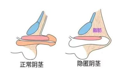 隐匿性阴茎是指阴茎发育正常但隐藏于耻骨脂肪垫下,阴茎外观短小的一类疾病,其存在以下一些特点:①阴茎外观短小②包皮呈“鸟嘴状”或“山丘状”③阴茎皮肤短缺和分布不均④挤压阴茎根部耻骨前脂肪,阴茎可伸出,但一放松阴茎又缩回⑤阴茎角呈钝角。